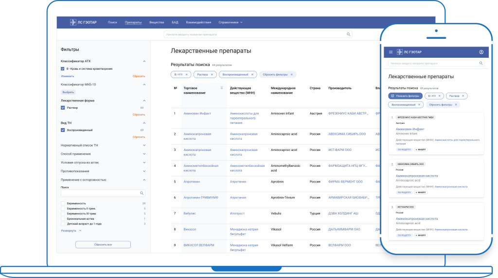 - Уникальный перекрестный поиск по всем характеристикам препарата (классификатор АТХ, МКБ-10, лекарственная форма, вид ТН, нормативный список ТН, способ применения, список наркотических средств и психотропных веществ, условия отпуска из аптек, противопоказания, применение с осторожностью, статус регистрационного удостоверения в РФ).